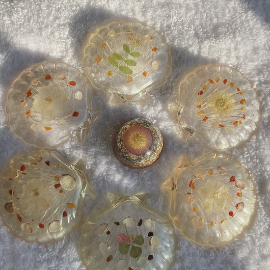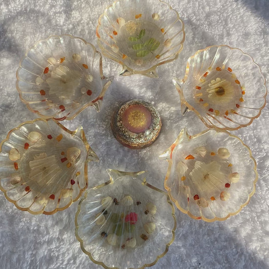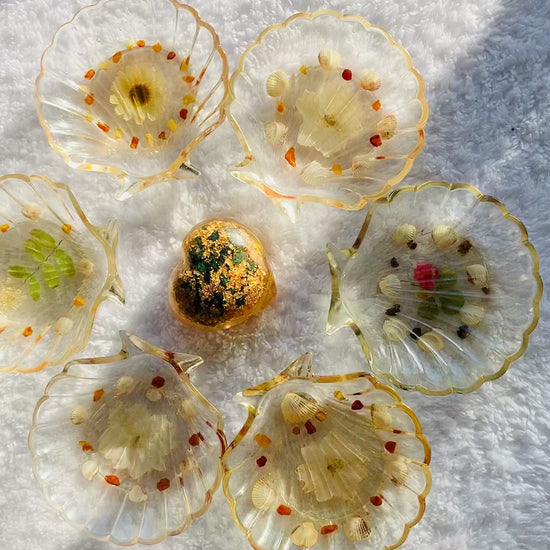 Dekoschale - Muschel aus Epoxidharz mit Muscheln, Bernsteinen und getrocknetem Blatt und Blüte/ Durchmesser - ca. 10,5 x 10cm