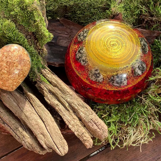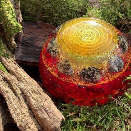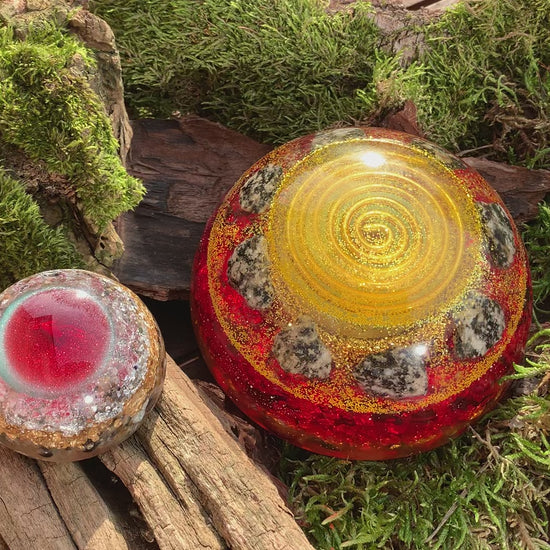 Orgonit-Raumharmonisierer XL Durchmesser ca.12,5 cm x Höhe ca. 7 cm, mit Edelsteinmischung / Goldene Spirale / Granitsteine / eingebaute Licht-Kugel