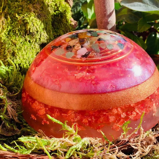 Orgonit-Raumharmonisierer XL - Modell "Kaya" Durchmesser ca.12,5 cm x Höhe ca. 7 cm, mit Edelsteinmischung / Kupfer Spirale / goldene Kugel